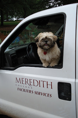 Here is a picture of Fitzi hard at work with her daddy. Everyone at the college knows her by name and loves to see her coming now. Unfortunately our dog-daughter doesn't want to work anymore. When she sees we are ready for work she puts herself in her crate! I guess we'll have to find another way for her to earn her keep. We were comparing pics now with baby pics and can't believe how big she's gotten!